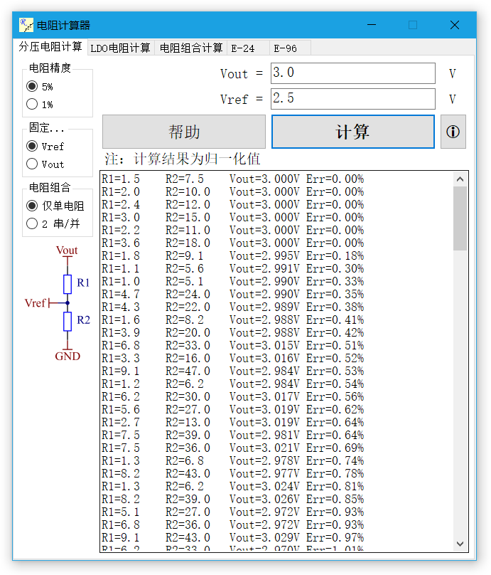 不知道为什么,网上找了一圈,没人写过类似的工具,就是已知分压电阻中的两个电压,来计算出应该使用的标准电阻值。能找到的都是用一个电压和两个电阻值来计算分压值……这特么小学生都会算好吧!