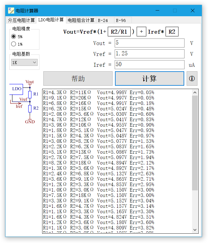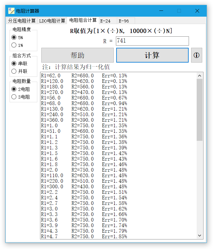 具备分压电阻计算、LDO电阻计算、组合电阻计算以及标准阻值表