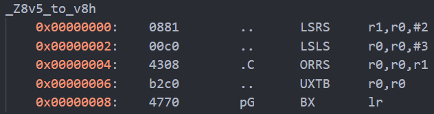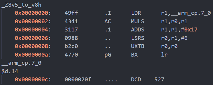 在我使用的Arm Cortex-M0+平台上,开启优化后5bit->8bit精确公式的编译结果如下: