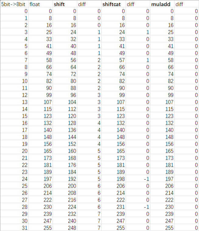 精确的转换应使用r8 = round((float)r5 * 255 / 31)得到,实际的缩放因子约为8.2258,直接移位丢失了小数部分。