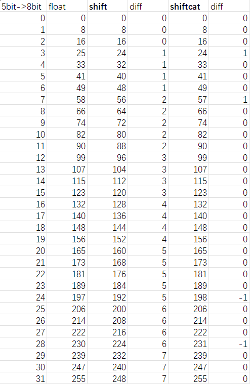 其来源是在简单移位的基础上加上了小数部分。5bit->8bit的缩放因子8.2258的小数部分约为0.25,即>>2,6bit->8bit的缩放因子4.0476的小数部分约为0.0625,即>>4。这是最接近小数位的实现。